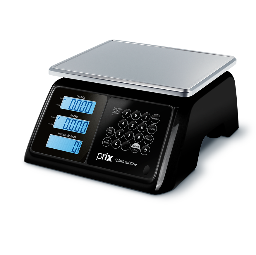 A balança eletrônica Prix Splash BP201W possui seis displays de cristal líquido em azul-claro, sendo três para o operador e três para o consumidor, além de sinalizadores de zero e líquido, tara fixa, peso estável e indicador de status da bateria.
